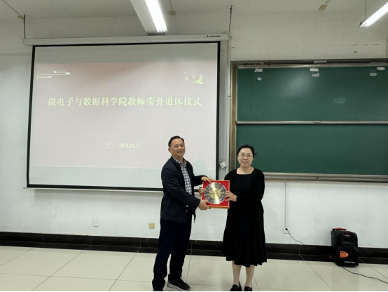 换届选举结束后,学院举行了范爱华教授荣誉退休仪式。学院党委书记汪春胜为范爱华颁发了“光荣退休”纪念匾,并对她几十年辛勤付出表达感谢,希望她退而不休,常回家看看,积极为学院献计献策,一如既往地关心和支持学院发展。