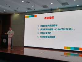 邀请在秀山校区振华图书馆第一学术报告厅作了题为“多波束测线问题解读与国赛优秀论文评析”的报告。报告会由学院院长杨二光主持,创新创业学院院长黄仙山、数学建模团队指导教师以及全校数学建模兴趣爱好者共计220余人参加了报告会。