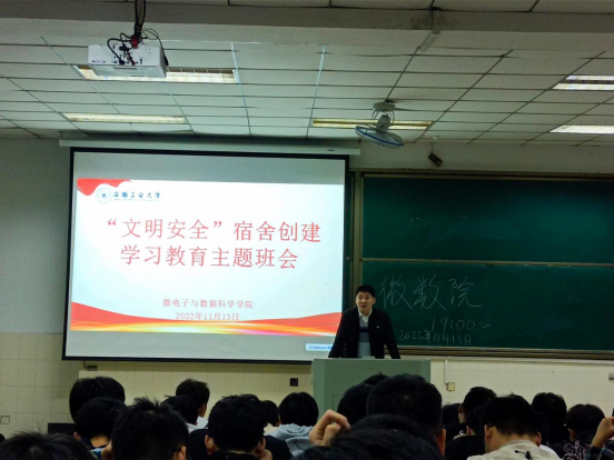 在阶梯教室202召开“文明安全”宿舍创建学习教育主题班会,会议由21级辅导员许丹丹、张佳良主持,21级全体同学参加。