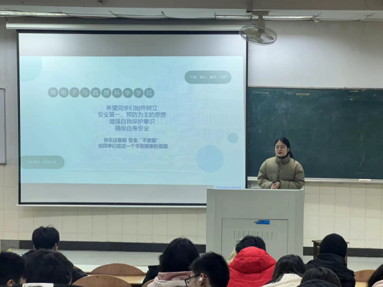 在阶教101召开“快乐过寒假,安全记心中”寒假安全教育大会,会议由辅导员王小花主讲,全体23级学生参会。