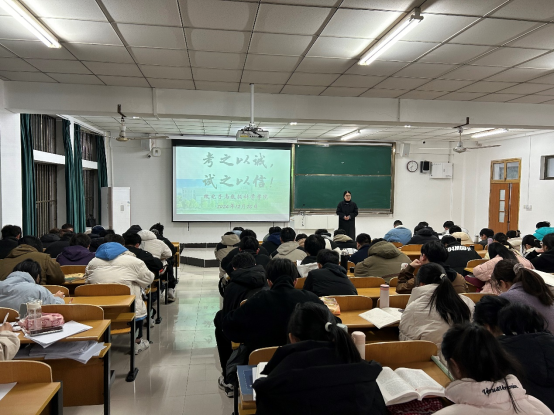 在东教103召开了“考之以诚,试之以信”--诚信考试教育暨期末动员大会,辅导员王小花主讲,2023级学生参加。